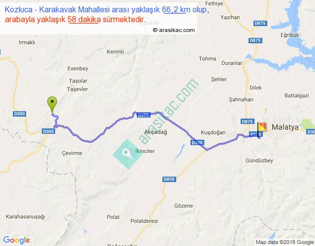 Kozluca - Karakavak Mahallesi arası yaklaşık olarak 90 km/h ile yukarıda belirtilen sürede olup, iki yerin kuş uçuşu uzaklığı (mesafesi) 50'dir. Yolculuk otobüsle 1 saat 15 dakika sürmektedir.