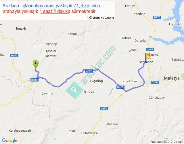 Kozluca - Şahnahan arası yaklaşık olarak 90 km/h ile yukarıda belirtilen sürede olup, iki yerin kuş uçuşu uzaklığı (mesafesi) 46'dir. Yolculuk otobüsle 1 saat 20 dakika sürmektedir.