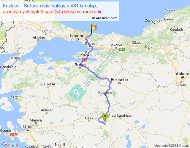 Kozluca - Sofular arası yaklaşık olarak 90 km/h ile yukarıda belirtilen sürede olup, iki yerin kuş uçuşu uzaklığı (mesafesi) 286'dir. Eğer belirtilen yerler arasında uçak seferi var ise bu süre uçakla 26 dakika'ya kadar düşebilir. Yolculuk otobüsle 7 saat 14 dakika sürmektedir.