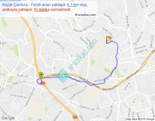Küçük Çamlıca - Ferah arası yaklaşık olarak 90 km/h ile yukarıda belirtilen sürede olup, iki yerin kuş uçuşu uzaklığı (mesafesi) 2'dir. Yolculuk otobüsle 13 dakika sürmektedir.