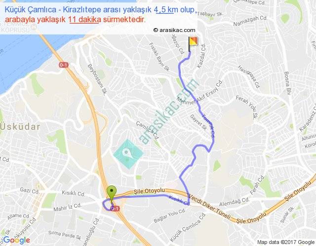 Küçük Çamlıca - Kirazlıtepe arası yaklaşık olarak 90 km/h ile yukarıda belirtilen sürede olup, iki yerin kuş uçuşu uzaklığı (mesafesi) 2'dir. Yolculuk otobüsle 14 dakika sürmektedir.