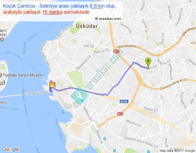 Küçük Çamlıca - Selimiye arası yaklaşık olarak 90 km/h ile yukarıda belirtilen sürede olup, iki yerin kuş uçuşu uzaklığı (mesafesi) 3'dir. Yolculuk otobüsle 9 dakika sürmektedir.