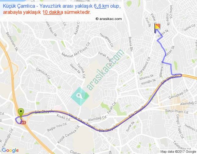 Küçük Çamlıca - Yavuztürk arası yaklaşık olarak 90 km/h ile yukarıda belirtilen sürede olup, iki yerin kuş uçuşu uzaklığı (mesafesi) 4'dir. Yolculuk otobüsle 13 dakika sürmektedir.
