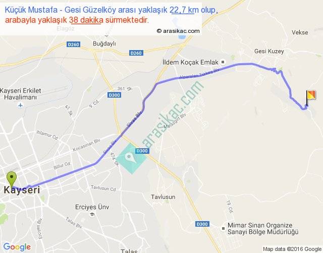Küçük Mustafa - Gesi Güzelköy arası yaklaşık olarak 90 km/h ile yukarıda belirtilen sürede olup, iki yerin kuş uçuşu uzaklığı (mesafesi) 18'dir. Yolculuk otobüsle 49 dakika sürmektedir.