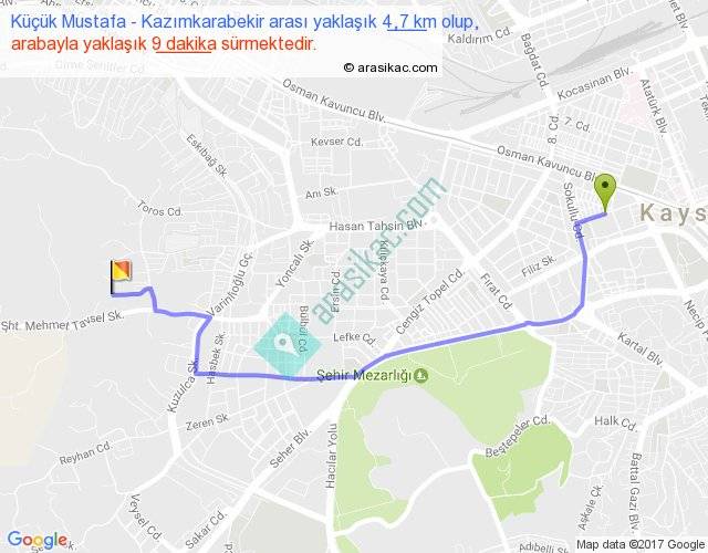 Küçük Mustafa - Kazımkarabekir arası yaklaşık olarak 90 km/h ile yukarıda belirtilen sürede olup, iki yerin kuş uçuşu uzaklığı (mesafesi) 3'dir. Yolculuk otobüsle 11 dakika sürmektedir.