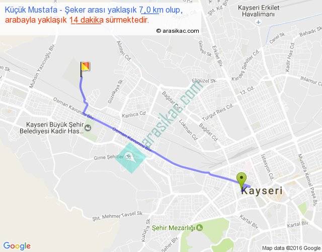 Küçük Mustafa - Şeker arası yaklaşık olarak 90 km/h ile yukarıda belirtilen sürede olup, iki yerin kuş uçuşu uzaklığı (mesafesi) 6'dir. Yolculuk otobüsle 18 dakika sürmektedir.