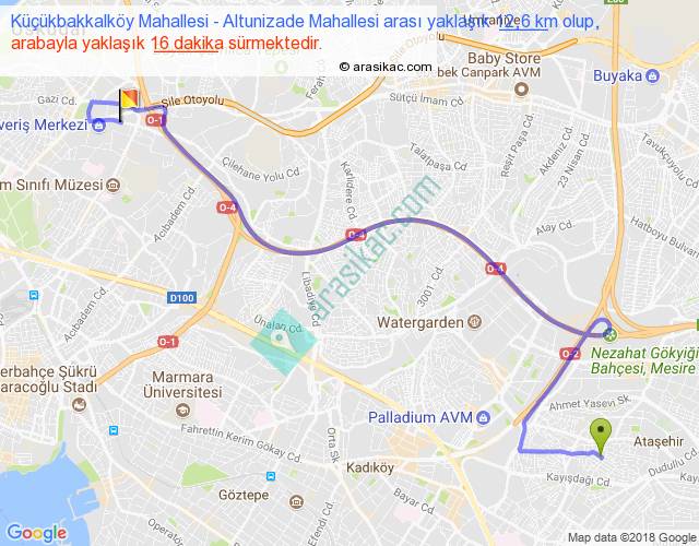 Küçükbakkalköy Mahallesi - Altunizade Mahallesi arası yaklaşık olarak 90 km/h ile yukarıda belirtilen sürede olup, iki yerin kuş uçuşu uzaklığı (mesafesi) 8'dir. Yolculuk otobüsle 20 dakika sürmektedir.