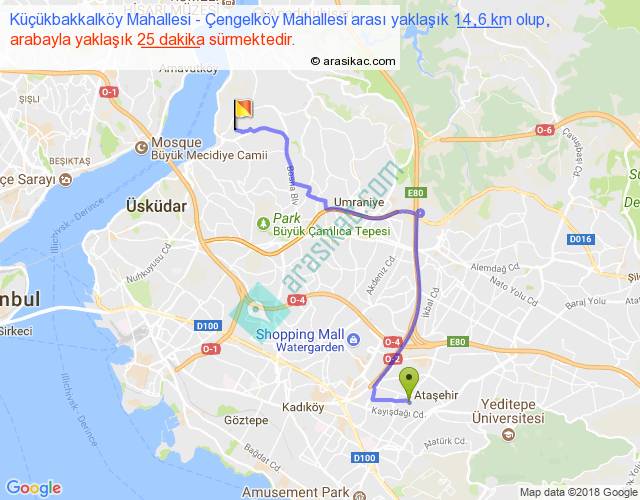 Küçükbakkalköy Mahallesi - Çengelköy Mahallesi arası yaklaşık olarak 90 km/h ile yukarıda belirtilen sürede olup, iki yerin kuş uçuşu uzaklığı (mesafesi) 9'dir. Yolculuk otobüsle 32 dakika sürmektedir.