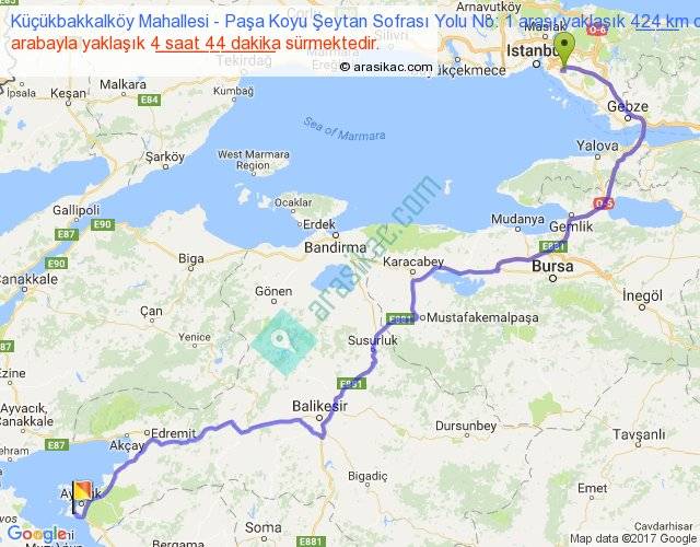 Küçükbakkalköy Mahallesi - Paşa Koyu Şeytan Sofrası Yolu No: 1 arası yaklaşık olarak 90 km/h ile yukarıda belirtilen sürede olup, iki yerin kuş uçuşu uzaklığı (mesafesi) 280'dir. Eğer belirtilen yerler arasında uçak seferi var ise bu süre uçakla 25 dakika'ya kadar düşebilir. Yolculuk otobüsle 6 saat 9 dakika sürmektedir.