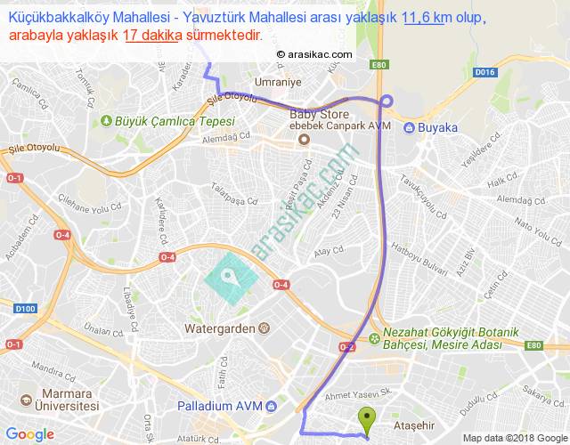 Küçükbakkalköy Mahallesi - Yavuztürk Mahallesi arası yaklaşık olarak 90 km/h ile yukarıda belirtilen sürede olup, iki yerin kuş uçuşu uzaklığı (mesafesi) 7'dir. Yolculuk otobüsle 22 dakika sürmektedir.