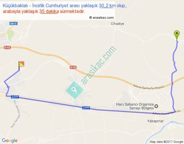 Küçükbaklalı - İncirlik Cumhuriyet arası yaklaşık olarak 90 km/h ile yukarıda belirtilen sürede olup, iki yerin kuş uçuşu uzaklığı (mesafesi) 17'dir. Yolculuk otobüsle 45 dakika sürmektedir.