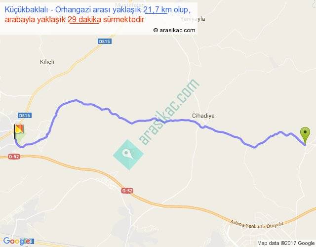 Küçükbaklalı - Orhangazi arası yaklaşık olarak 90 km/h ile yukarıda belirtilen sürede olup, iki yerin kuş uçuşu uzaklığı (mesafesi) 18'dir. Yolculuk otobüsle 37 dakika sürmektedir.