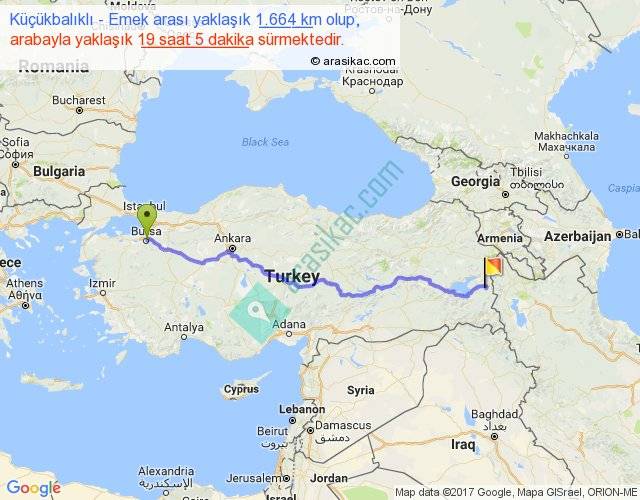 Küçükbalıklı - Emek arası yaklaşık olarak 90 km/h ile yukarıda belirtilen sürede olup, iki yerin kuş uçuşu uzaklığı (mesafesi) 1284'dir. Eğer belirtilen yerler arasında uçak seferi var ise bu süre uçakla 1 saat 58 dakika'ya kadar düşebilir. Yolculuk otobüsle 1 gün 0 saat sürmektedir.