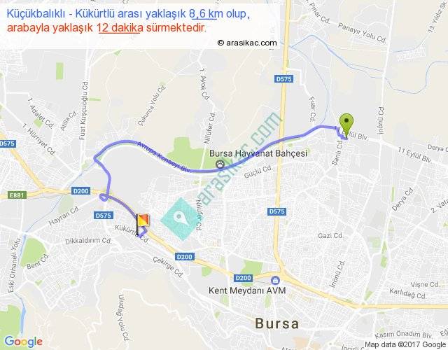 Küçükbalıklı - Kükürtlü arası yaklaşık olarak 90 km/h ile yukarıda belirtilen sürede olup, iki yerin kuş uçuşu uzaklığı (mesafesi) 5'dir. Yolculuk otobüsle 15 dakika sürmektedir.