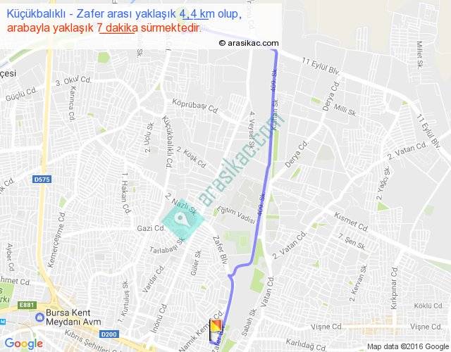 Küçükbalıklı - Zafer arası yaklaşık olarak 90 km/h ile yukarıda belirtilen sürede olup, iki yerin kuş uçuşu uzaklığı (mesafesi) 3'dir. Yolculuk otobüsle 9 dakika sürmektedir.