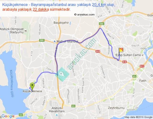 Küçükçekmece - Bayrampaşa İstanbul arası yaklaşık olarak 90 km/h ile yukarıda belirtilen sürede olup, iki yerin kuş uçuşu uzaklığı (mesafesi) 11'dir. Yolculuk otobüsle 28 dakika sürmektedir.