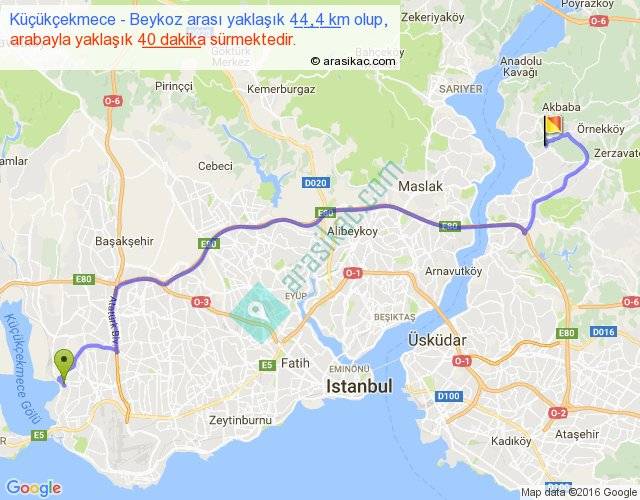 Küçükçekmece - Beykoz arası yaklaşık olarak 90 km/h ile yukarıda belirtilen sürede olup, iki yerin kuş uçuşu uzaklığı (mesafesi) 31'dir. Yolculuk otobüsle 52 dakika sürmektedir.