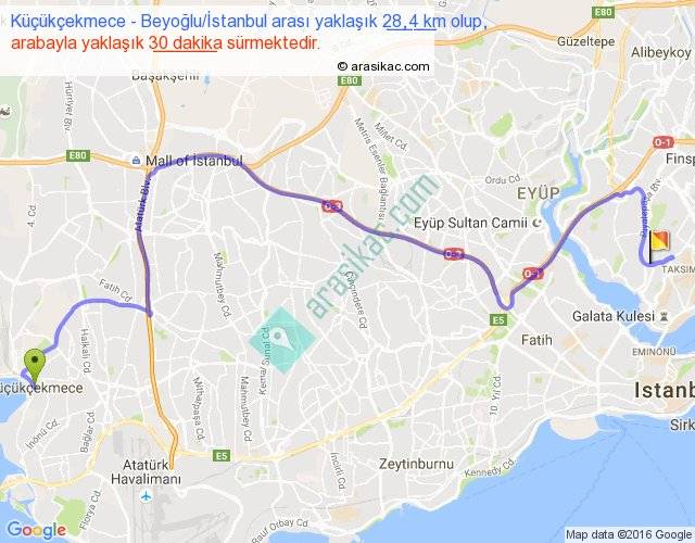 Küçükçekmece - Beyoğlu İstanbul arası yaklaşık olarak 90 km/h ile yukarıda belirtilen sürede olup, iki yerin kuş uçuşu uzaklığı (mesafesi) 17'dir. Yolculuk otobüsle 39 dakika sürmektedir.