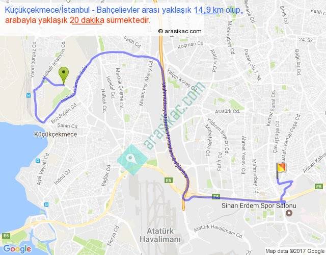 Küçükçekmece İstanbul - Bahçelievler arası yaklaşık olarak 90 km/h ile yukarıda belirtilen sürede olup, iki yerin kuş uçuşu uzaklığı (mesafesi) 7'dir. Yolculuk otobüsle 26 dakika sürmektedir.