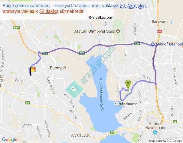 Küçükçekmece İstanbul - Esenyurt İstanbul arası yaklaşık olarak 90 km/h ile yukarıda belirtilen sürede olup, iki yerin kuş uçuşu uzaklığı (mesafesi) 10'dir. Yolculuk otobüsle 41 dakika sürmektedir.