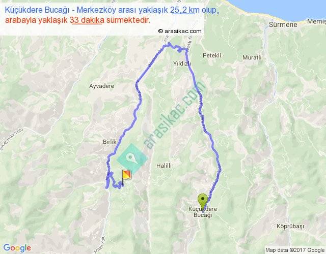 Küçükdere Bucağı - Merkezköy arası yaklaşık olarak 90 km/h ile yukarıda belirtilen sürede olup, iki yerin kuş uçuşu uzaklığı (mesafesi) 5'dir. Yolculuk otobüsle 42 dakika sürmektedir.