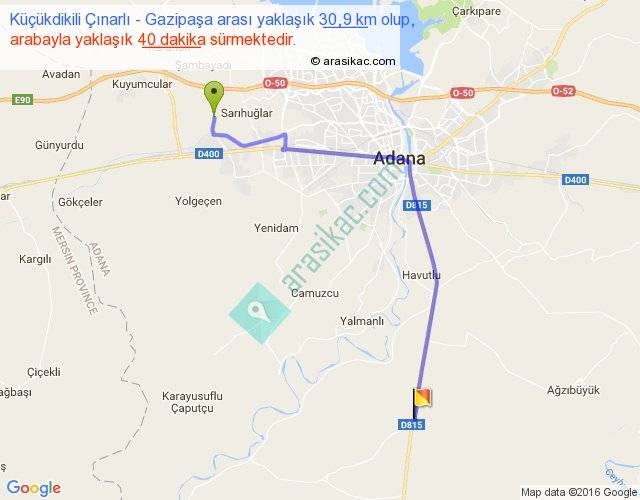 Küçükdikili Çınarlı - Gazipaşa arası yaklaşık olarak 90 km/h ile yukarıda belirtilen sürede olup, iki yerin kuş uçuşu uzaklığı (mesafesi) 22'dir. Yolculuk otobüsle 52 dakika sürmektedir.
