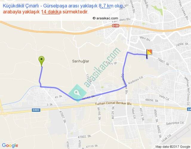 Küçükdikili Çınarlı - Gürselpaşa arası yaklaşık olarak 90 km/h ile yukarıda belirtilen sürede olup, iki yerin kuş uçuşu uzaklığı (mesafesi) 5'dir. Yolculuk otobüsle 18 dakika sürmektedir.