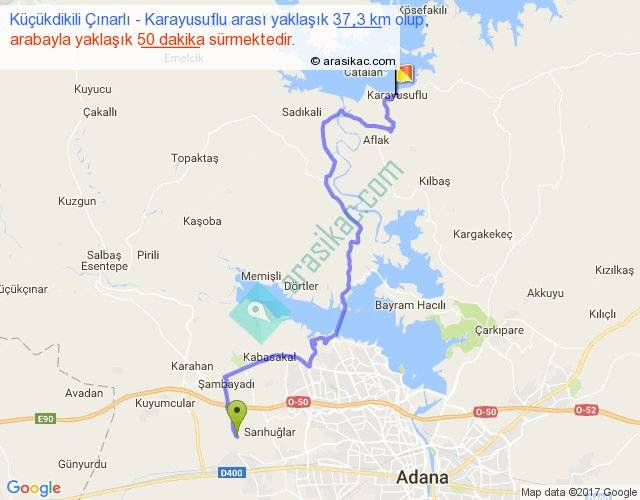 Küçükdikili Çınarlı - Karayusuflu arası yaklaşık olarak 90 km/h ile yukarıda belirtilen sürede olup, iki yerin kuş uçuşu uzaklığı (mesafesi) 23'dir. Yolculuk otobüsle 1 saat 5 dakika sürmektedir.