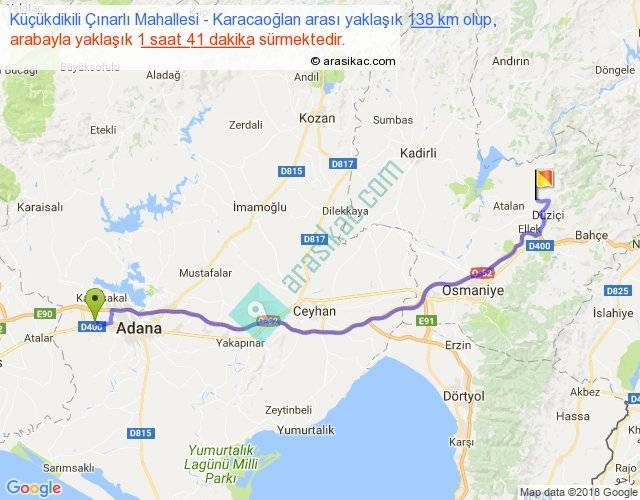 Küçükdikili Çınarlı Mahallesi - Karacaoğlan arası yaklaşık olarak 90 km/h ile yukarıda belirtilen sürede olup, iki yerin kuş uçuşu uzaklığı (mesafesi) 111'dir. Yolculuk otobüsle 2 saat 11 dakika sürmektedir.