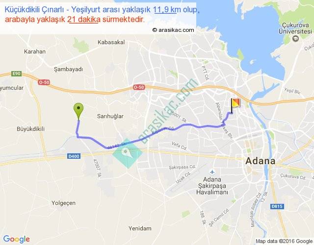 Küçükdikili Çınarlı - Yeşilyurt arası yaklaşık olarak 90 km/h ile yukarıda belirtilen sürede olup, iki yerin kuş uçuşu uzaklığı (mesafesi) 9'dir. Yolculuk otobüsle 27 dakika sürmektedir.
