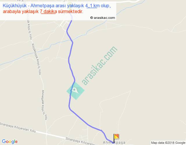 Küçükhüyük - Ahmetpaşa arası yaklaşık olarak 90 km/h ile yukarıda belirtilen sürede olup, iki yerin kuş uçuşu uzaklığı (mesafesi) 4'dir. Yolculuk otobüsle 9 dakika sürmektedir.