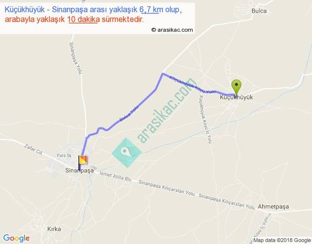 Küçükhüyük - Sinanpaşa arası yaklaşık olarak 90 km/h ile yukarıda belirtilen sürede olup, iki yerin kuş uçuşu uzaklığı (mesafesi) 5'dir. Yolculuk otobüsle 13 dakika sürmektedir.