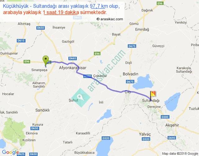 Küçükhüyük - Sultandağı arası yaklaşık olarak 90 km/h ile yukarıda belirtilen sürede olup, iki yerin kuş uçuşu uzaklığı (mesafesi) 84'dir. Yolculuk otobüsle 1 saat 42 dakika sürmektedir.