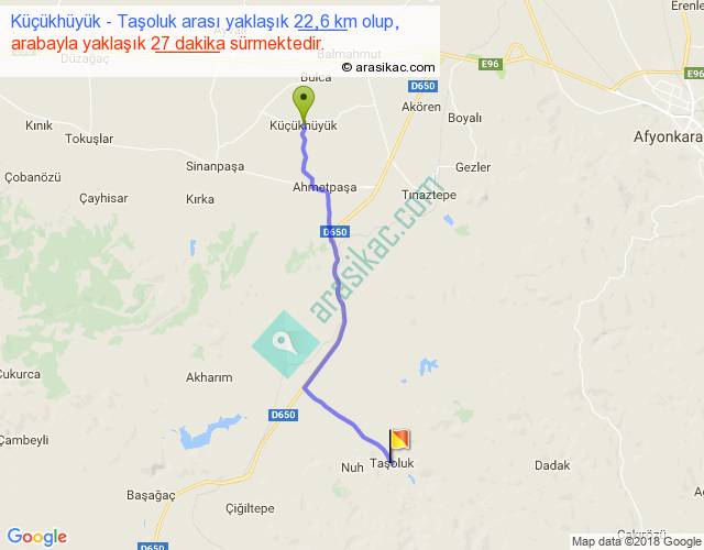 Küçükhüyük - Taşoluk arası yaklaşık olarak 90 km/h ile yukarıda belirtilen sürede olup, iki yerin kuş uçuşu uzaklığı (mesafesi) 19'dir. Yolculuk otobüsle 35 dakika sürmektedir.