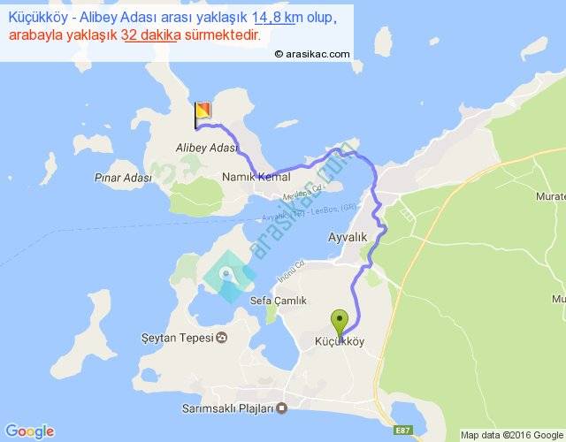 Küçükköy - Alibey Adası arası yaklaşık olarak 90 km/h ile yukarıda belirtilen sürede olup, iki yerin kuş uçuşu uzaklığı (mesafesi) 8'dir. Yolculuk otobüsle 41 dakika sürmektedir.