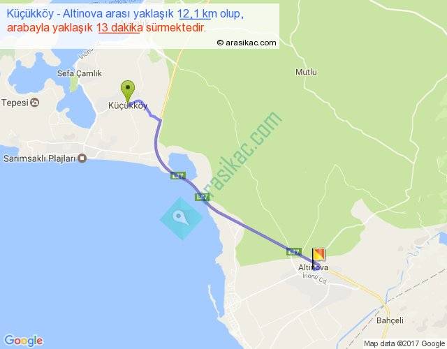 Küçükköy - Altinova arası yaklaşık olarak 90 km/h ile yukarıda belirtilen sürede olup, iki yerin kuş uçuşu uzaklığı (mesafesi) 10'dir. Yolculuk otobüsle 16 dakika sürmektedir.