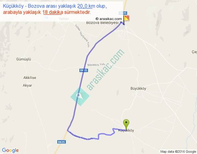 Küçükköy - Bozova arası yaklaşık olarak 90 km/h ile yukarıda belirtilen sürede olup, iki yerin kuş uçuşu uzaklığı (mesafesi) 10'dir. Yolculuk otobüsle 23 dakika sürmektedir.