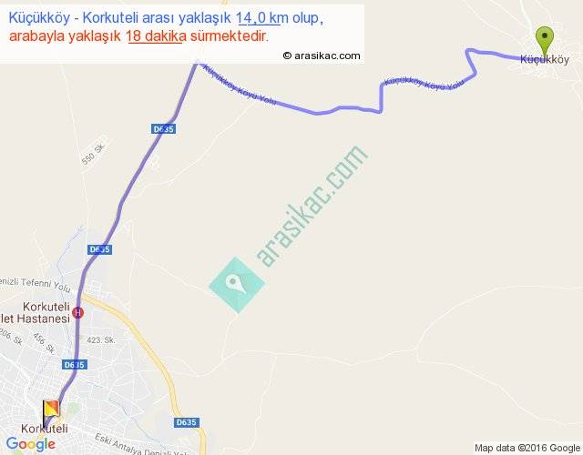 Küçükköy - Korkuteli arası yaklaşık olarak 90 km/h ile yukarıda belirtilen sürede olup, iki yerin kuş uçuşu uzaklığı (mesafesi) 10'dir. Yolculuk otobüsle 23 dakika sürmektedir.