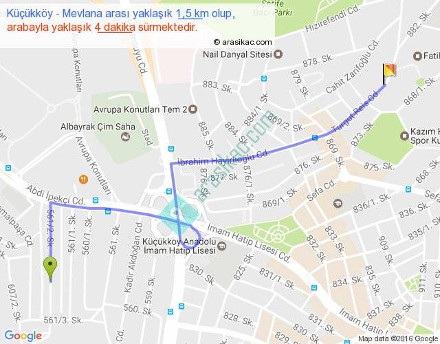 Küçükköy - Mevlana arası yaklaşık olarak 90 km/h ile yukarıda belirtilen sürede olup, iki yerin kuş uçuşu uzaklığı (mesafesi) 1'dir. Yolculuk otobüsle 5 dakika sürmektedir.