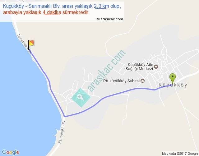 Küçükköy - Sarımsaklı Blv. arası yaklaşık olarak 90 km/h ile yukarıda belirtilen sürede olup, iki yerin kuş uçuşu uzaklığı (mesafesi) 2'dir. Yolculuk otobüsle 5 dakika sürmektedir.