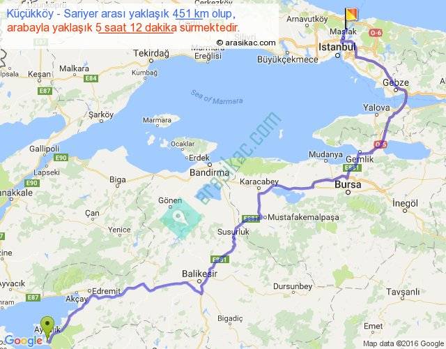 Küçükköy - Sariyer arası yaklaşık olarak 90 km/h ile yukarıda belirtilen sürede olup, iki yerin kuş uçuşu uzaklığı (mesafesi) 287'dir. Eğer belirtilen yerler arasında uçak seferi var ise bu süre uçakla 26 dakika'ya kadar düşebilir. Yolculuk otobüsle 6 saat 45 dakika sürmektedir.