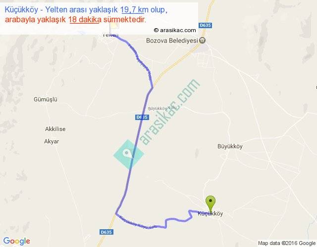 Küçükköy - Yelten arası yaklaşık olarak 90 km/h ile yukarıda belirtilen sürede olup, iki yerin kuş uçuşu uzaklığı (mesafesi) 13'dir. Yolculuk otobüsle 23 dakika sürmektedir.