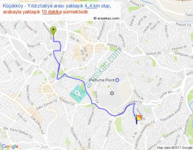 Küçükköy - Yıldıztabya arası yaklaşık olarak 90 km/h ile yukarıda belirtilen sürede olup, iki yerin kuş uçuşu uzaklığı (mesafesi) 3'dir. Yolculuk otobüsle 13 dakika sürmektedir.
