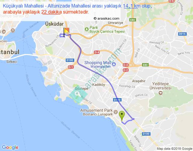 Küçükyalı Mahallesi - Altunizade Mahallesi arası yaklaşık olarak 90 km/h ile yukarıda belirtilen sürede olup, iki yerin kuş uçuşu uzaklığı (mesafesi) 10'dir. Yolculuk otobüsle 28 dakika sürmektedir.