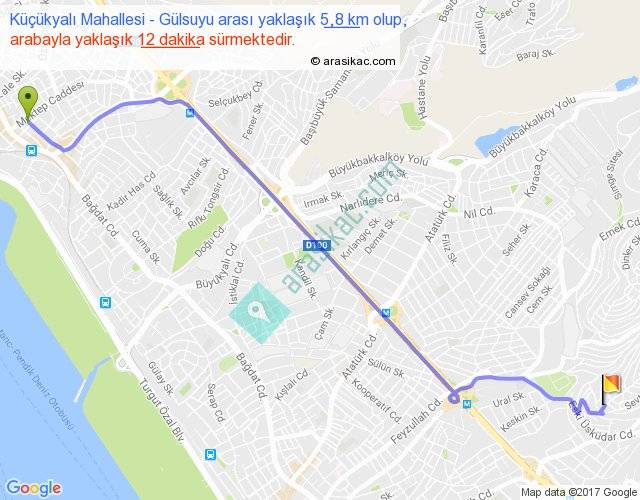 Küçükyalı Mahallesi - Gülsuyu arası yaklaşık olarak 90 km/h ile yukarıda belirtilen sürede olup, iki yerin kuş uçuşu uzaklığı (mesafesi) 5'dir. Yolculuk otobüsle 15 dakika sürmektedir.