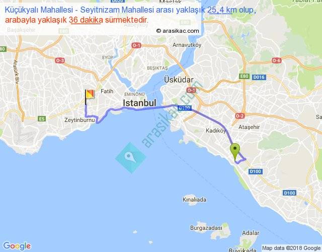 Küçükyalı Mahallesi - Seyitnizam Mahallesi arası yaklaşık olarak 90 km/h ile yukarıda belirtilen sürede olup, iki yerin kuş uçuşu uzaklığı (mesafesi) 18'dir. Yolculuk otobüsle 46 dakika sürmektedir.