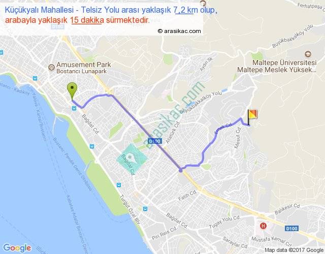 Küçükyalı Mahallesi - Telsiz Yolu arası yaklaşık olarak 90 km/h ile yukarıda belirtilen sürede olup, iki yerin kuş uçuşu uzaklığı (mesafesi) 5'dir. Yolculuk otobüsle 19 dakika sürmektedir.