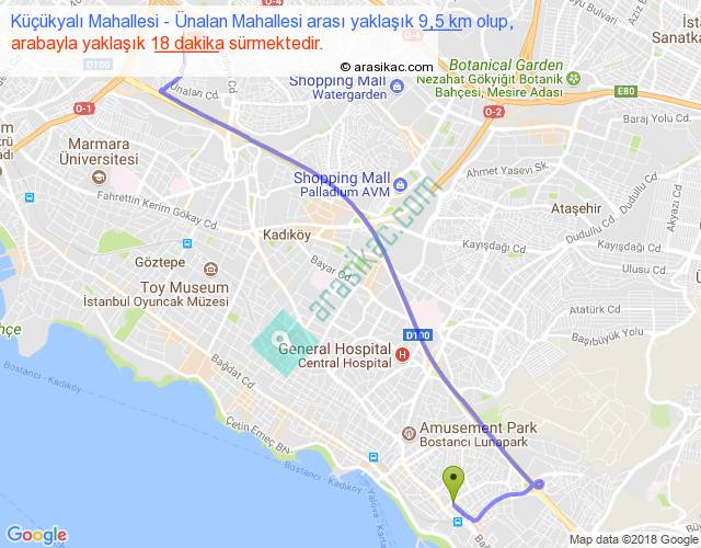 Küçükyalı Mahallesi - Ünalan Mahallesi arası yaklaşık olarak 90 km/h ile yukarıda belirtilen sürede olup, iki yerin kuş uçuşu uzaklığı (mesafesi) 7'dir. Yolculuk otobüsle 23 dakika sürmektedir.