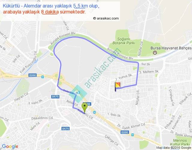 Kükürtlü - Alemdar arası yaklaşık olarak 90 km/h ile yukarıda belirtilen sürede olup, iki yerin kuş uçuşu uzaklığı (mesafesi) 1'dir. Yolculuk otobüsle 10 dakika sürmektedir.
