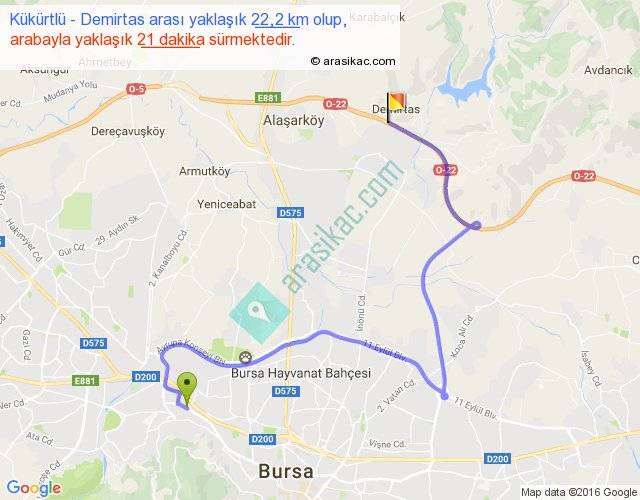Kükürtlü - Demirtas arası yaklaşık olarak 90 km/h ile yukarıda belirtilen sürede olup, iki yerin kuş uçuşu uzaklığı (mesafesi) 10'dir. Yolculuk otobüsle 27 dakika sürmektedir.